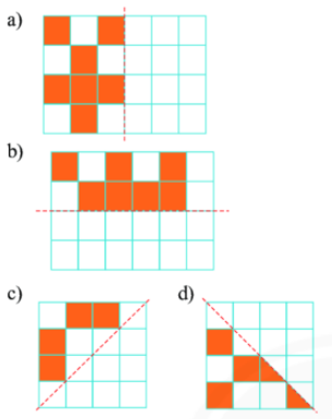 Em hãy vẽ các hình sau vào vở rồi tô màu các ô vuông để mỗi hình thu được nhận đường nét đứt là trục đối xứng.