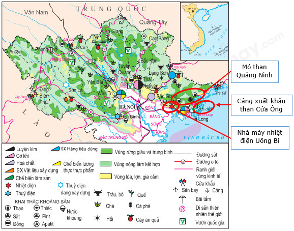 c) Xác định vị trí mỏ than Quảng Ninh, nhà máy nhiệt điện Uông Bí và cảng xuất khẩu than Cửa Ông.