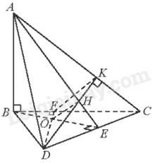Mà \(\left( {ABE} \right) \bot \left( {ACD} \right),\left( {DFK} \right) \bot \left( {ADC} \right)\) và nên \(OH \bot \left( {ACD} \right)\)