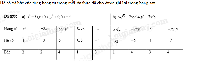 Hệ số và bậc của từng hạng tử trong mỗi đa thức đã cho được ghi lại trong bảng sau: