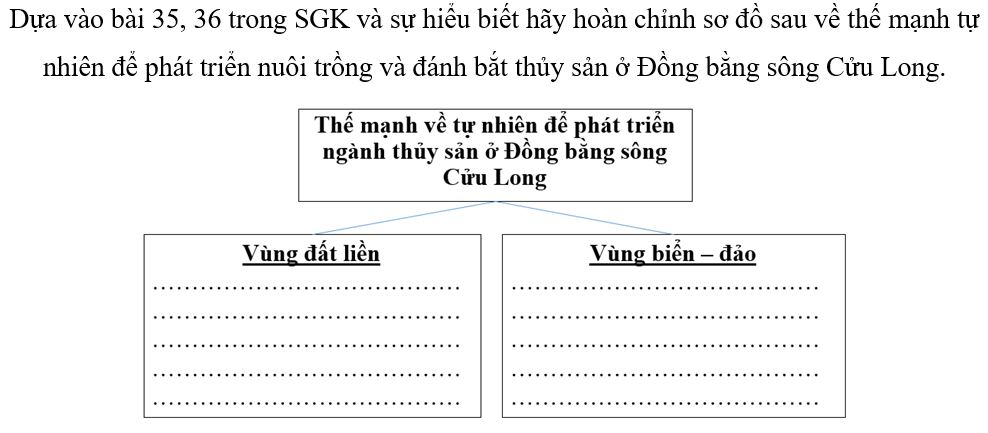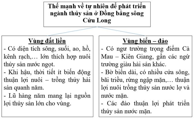 Giải bài 2 trang 90 vở bài tập Địa lí 9, Dựa vào bài 35, 36 trong SGK và sự hiểu biết hãy hoàn chỉnh sơ đồ sau về thế mạnh tự nhiên để phát triển nuôi trồng và đánh bắt thủy sản ở Đồng bằng sông Cửu Long.