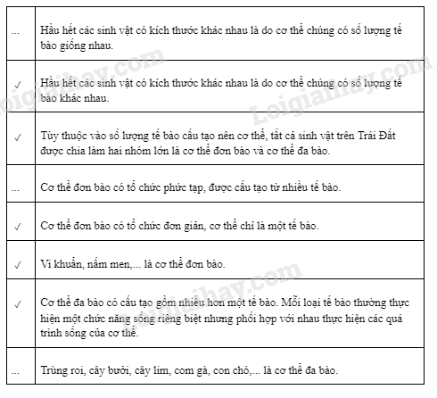 Hầu hết các sinh vật có kích thước khác nhau là do cơ thể chúng có số lượng tế bào khác nhau.