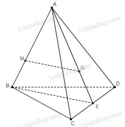 Gọi \(E\) là trung điểm của \(CD\). Do \(G\) là trọng tâm tam giác \(ACD\), ta suy ra ba điểm \(A\), \(G\), \(E\) thẳng hàng và \(\frac{{AG}}{{AE}} = \frac{2}{3}\).