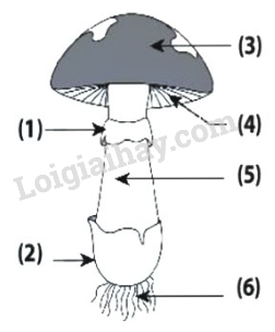 Quan sát hình bên về cấu tạo nấm độc và trả lời a) Tên các thành phần cấu tạo nấm độc (1), (2), (3), (4), (5), (6) là gì? b) Thành phần cấu tạo nào sau đây thường có ở nấm độc mà không có ở nấm ăn được?