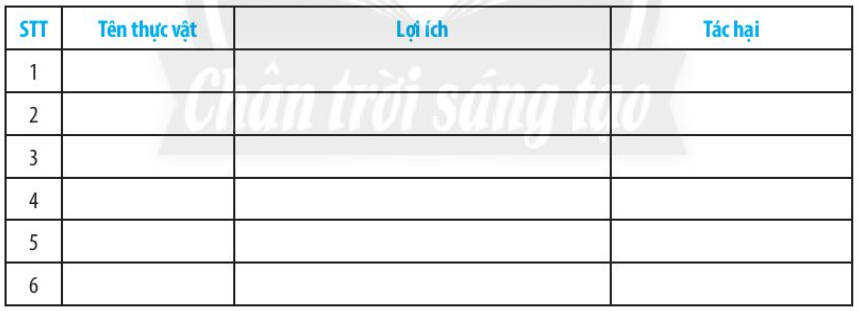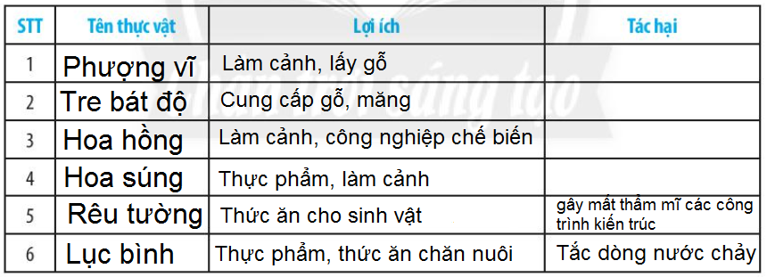 Hãy nêu tên một số thực vật và lợi ích, tác hại của các loại thực vật đó trong tự nhiên và trong thực tiễn bằng cách hoàn thành bảng sau: