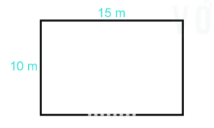 Bài 3 (4.18). Một khu vườn hình chữ nhật có chiều dài 15 m và chiều rộng 10 m như hình bên, cổng vào có độ rộng bằng \(60{\rm{ }}c{m^2}\) chiều dài, phần còn lại là hàng rào. Hỏi hàng rào của khu vườn dài bao nhiêu mét?