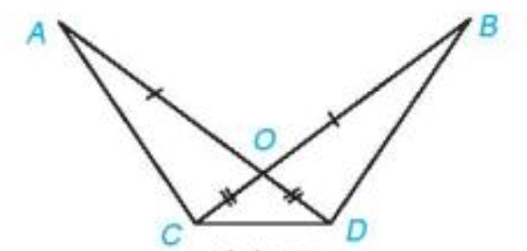 Bài 3 (4.31). Cho năm điểm A, B,C,D,O như hình vẽ. Biết rằng OA = OB, OC = OD. a) Chứng minh rằng AC=BD. b) Chứng minh rằng \(\Delta ACD = \Delta BDC\)