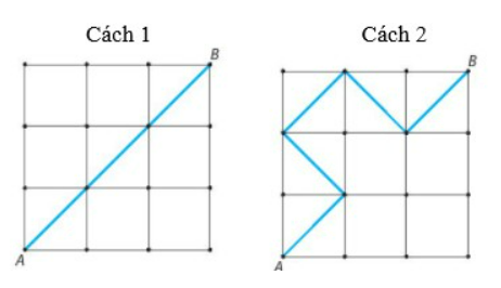 Hai cách để con kiến bò từ A đến B theo đường chéo các hình vuông nhỏ là