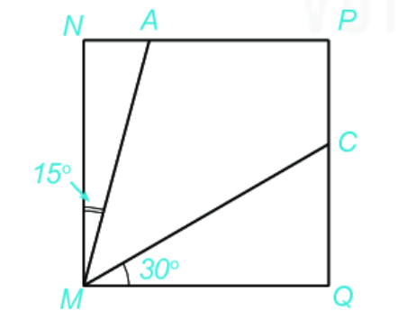 Bài 3 (8.37). Cho hình vuông MNPQ và số đo các góc ghi tương ứng như trong hình bên. a) Kể tên các điểm nằm trong góc AMC. b) Cho biết số đo của góc AMC bằng cách đo. c) Sắp xếp các góc NMA, AMC và CMQ theo thứ tự số đo tăng dần.