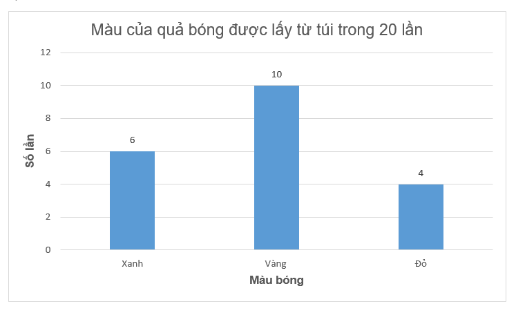 b) Em hãy lấy một quả bóng từ túi đó 20 lần, sau mỗi lần ghi lại xem quả bóng lấy được màu gì rồi trả lại  túi trước khi lấy lần sau. Hoàn thiện bảng thống kê sau: