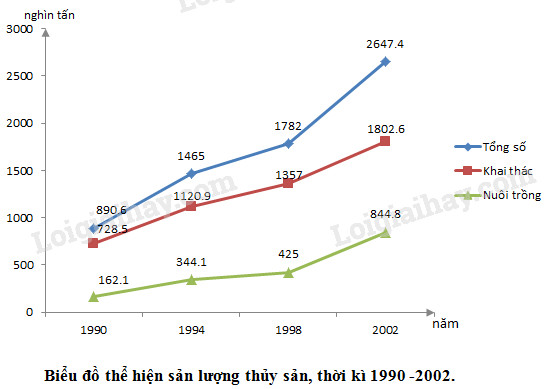 – Vẽ 3 đường biểu diễn lần lượt thể hiện tổng số, khai thác và nuôi trồng (không cần xử lí số liệu).