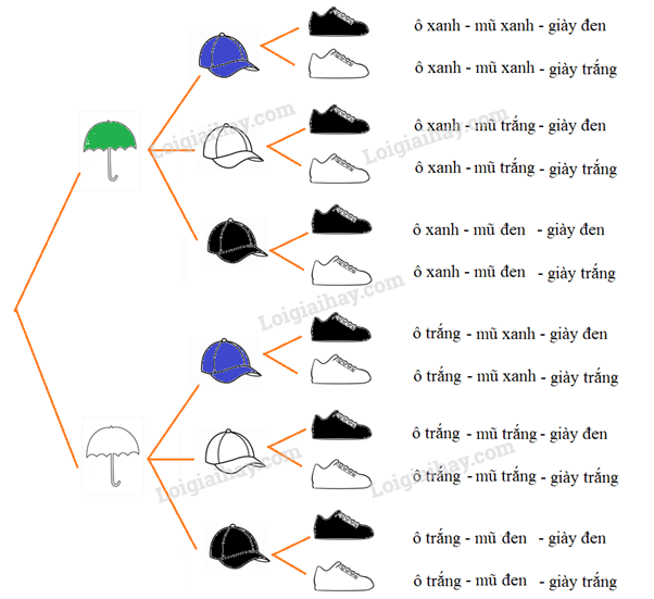 Dựa vào sơ đồ cây, ta có số cách chọn 1 ô, 1 mũ và 1 đôi giày là 12 cách.