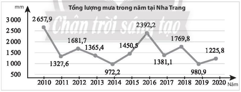 Tổng lượng mưa trong năm tại một trạm quan trắc đặt tại Nha Trang từ 2010 đến 2020 được thể hiện trong biểu đồ sau (đơn vị: mm).