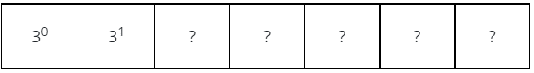 Thay mỗi dấu “?” bởi một lũy thừa của 3, biết rằng từ ô thứ ba, lũy thừa cần tìm là tích của hai lũy thừa ở hai ô liền trước.