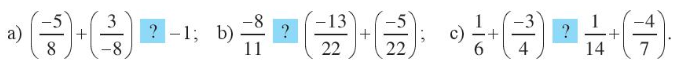 b)\(\left( {\frac{{ – 13}}{{22}}} \right) + \left( {\frac{{ – 5}}{{22}}} \right) = \frac{{ – 18}}{{22}} = \frac{{ – 9}}{{11}} < \frac{{ – 8}}{{11}}\).