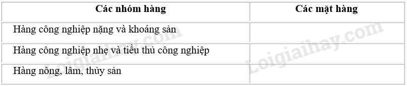 Hãy xếp các mặt hàng xuất khẩu chủ yếu sau đây vào những nhóm hàng tương ứng ở bảng bên.