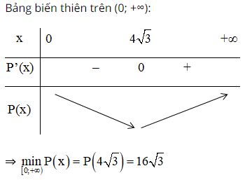 Xét hàm số \(P\left( x \right)=2\left( x+\dfrac{48}{x} \right)\) trên \(\left( 0;+\infty  \right)\) ta có: