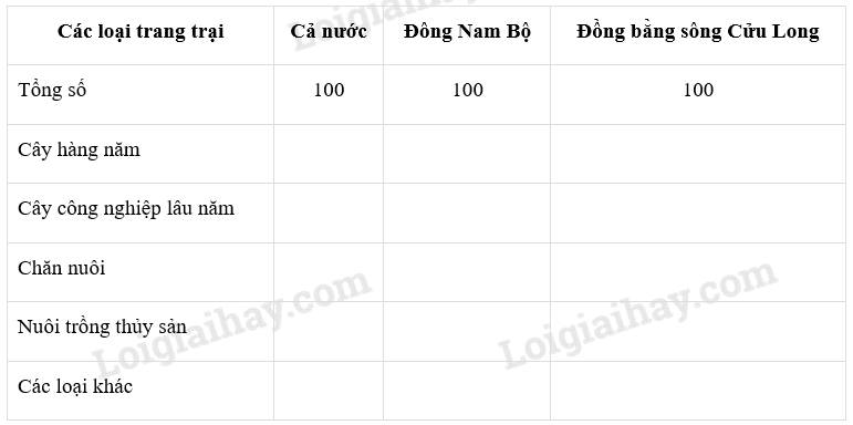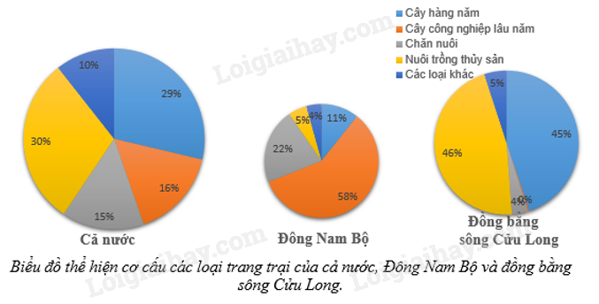 – Vẽ biểu đồ thể hiện cơ cấu của các loại trang trại của cả nước, Đông Nam Bộ và đồng bằng sông Cửu Long năm 2006.