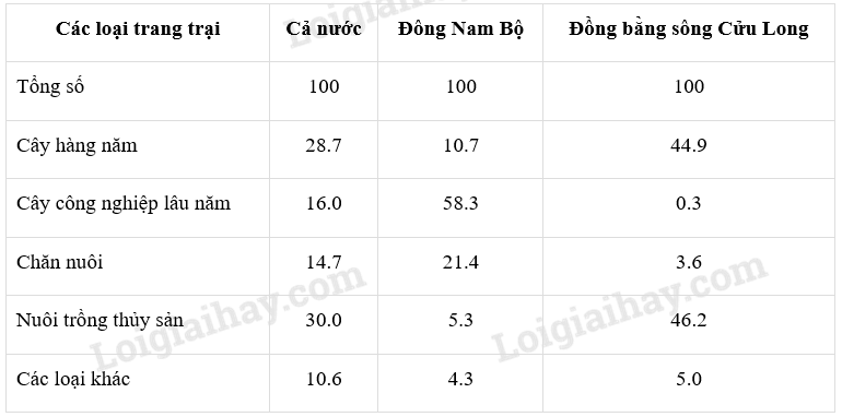 – Nhận xét về cơ cấu các loại trang trại của cả nước, Đông Nam Bộ và đồng bằng sông Cửu Long năm 2006 từ biểu đồ đã vẽ: