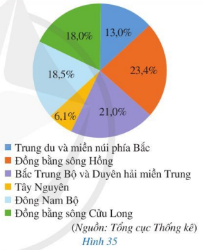 Theo kết quả tổng điều tra dân số và nhà ở năm 2019, dân số nước ta là 96 208 984 người và quy mô dân số theo sáu vùng kinh tế – xã hội được biểu diễn bằng biểu đồ hình quạt tròn ở Hình 35.