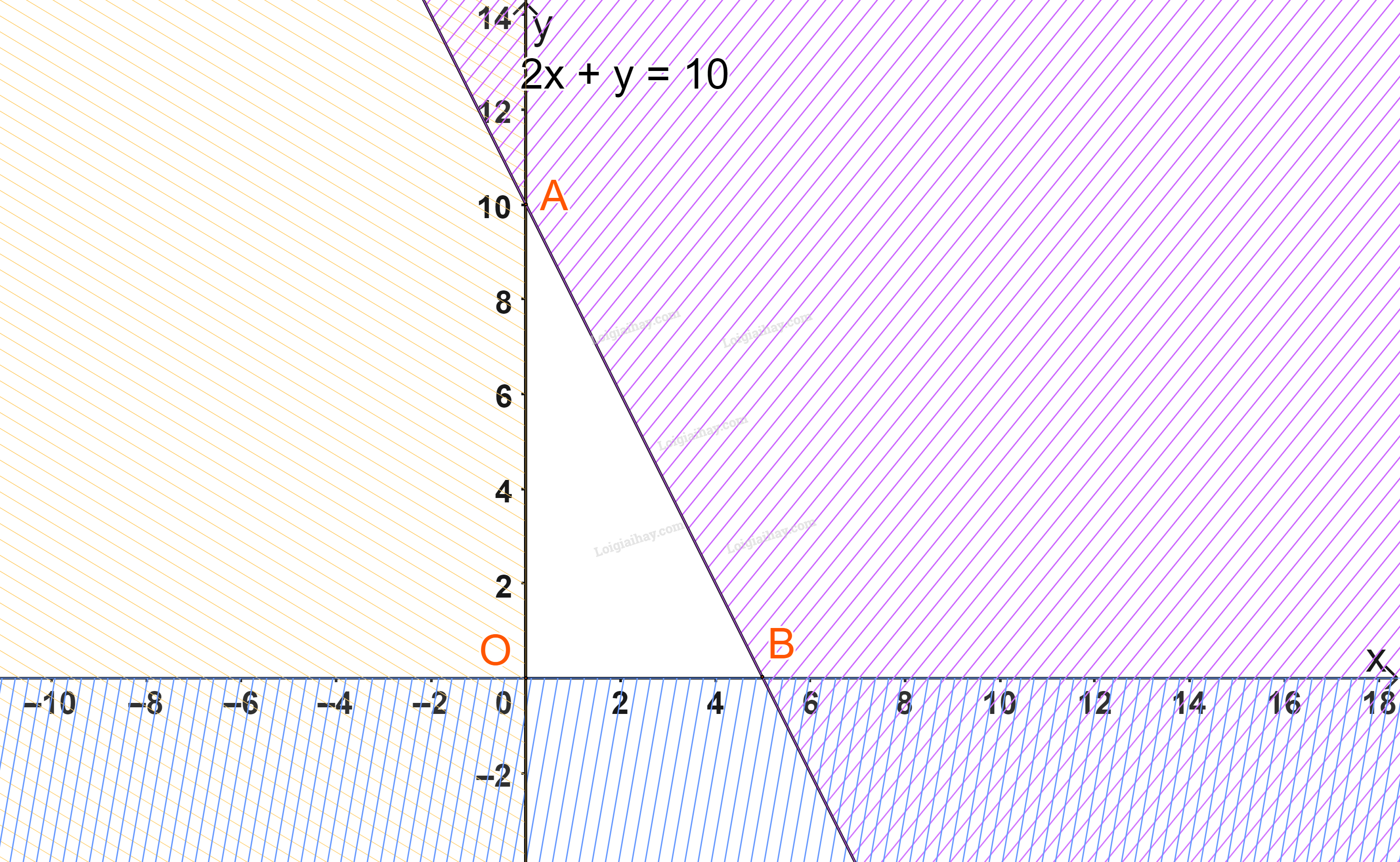 Miền không gạch chéo (miền tam giác OAB, bao gồm cả các cạnh) trong hình trên là phần giao của các miền nghiệm và cũng là phần biểu diễn nghiệm của hệ bất phương trình.