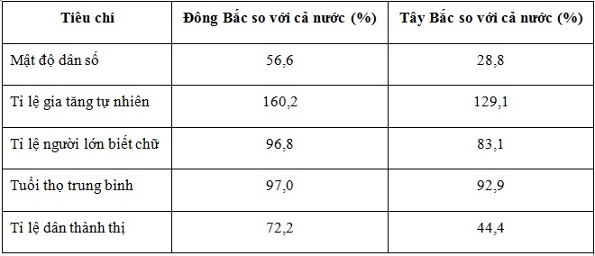 Dưới đây là một số tiêu chí về dân cư, xã hội ở Trung du và miền núi Bắc Bộ.