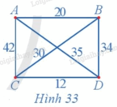 Giả sử chi phí di chuyển giữa các địa điểm được mô tả ở Hình 33 (đơn vị: nghìn đồng). Ta nên chọn theo chu trình nào đi qua tất cả các địa điểm để tổng chi phí di chuyển là thấp nhất? Chi phí thấp nhất đó bằng bao nhiêu?