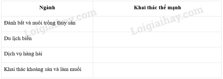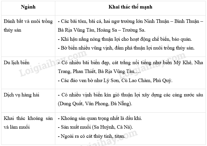 Dựa vào kiến thức đã học và hình 36 trong SGK Địa lí 12 và Atlat Địa lí Việt Nam, hãy điền vào bảng sau các thế mạnh để phát triển từng ngành kinh tế biển ở Duyên hải Nam Trung Bộ.