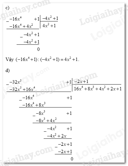 Vậy \(( – 32{x^5} + 1):( – 2x + 1) = 16{x^4} + 8{x^3} + 4{x^2} + 2x + 1\).