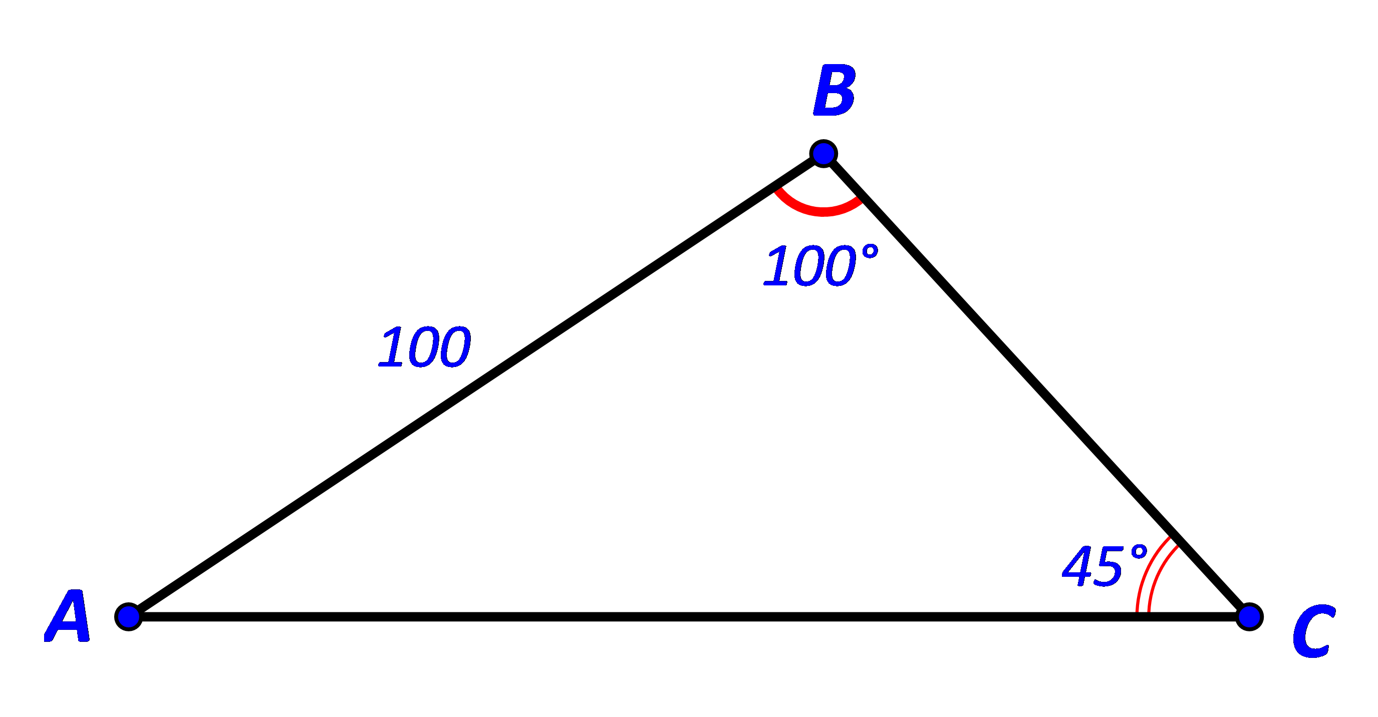 Cho tam giác ABC có \(AB = 100,\widehat B = {100^o},\widehat C = {45^o}.\) Tính: