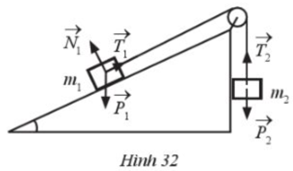 Trong mặt phẳng nghiêng không có ma sát, cho hệ vật m1, m2, hai vật nối với nhau bằng một sợi dây không dãn vắt qua ròng rọc (Hình 32). Giả sử bỏ qua khối lượng của dây và ma sát của ròng rọc