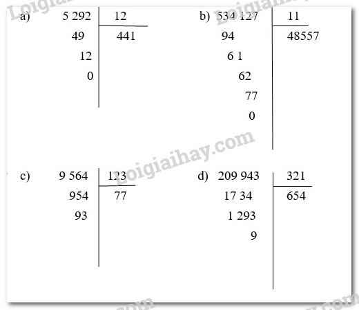 Đặt tính rồi tính a) 5 292: 12 ; b) 534 127 : 11 ; c) 9 564 : 123 ; d) 209 943 : 321.