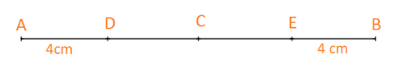 Cho đoạn thẳng AB có độ dài 18 cm và trung điểm C của đoạn thẳng đó. Lấy điểm D thuộc đoạn thẳng CA và điểm E thuộc đoạn thẳng CB sao cho \(AD = BE = 4\,cm\). Điểm C có là trung điểm của đoạn thẳng DE không? Vì sao?