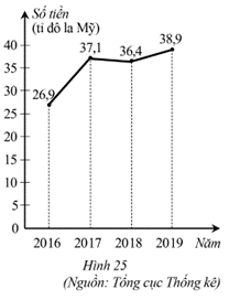 Biểu đồ đoạn thẳng ở Hình 25 biểu diễn số vốn đầu tư nước ngoài vào Việt Nam trong các năm 2016, 2017, 2018, 2019.