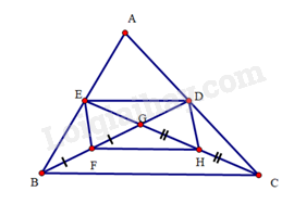 a)     Do \(G\) là trọng tâm tam giác \(ABC\) nên \(DG = \frac{1}{2}BG,EG = \frac{1}{2}CG\). Mà \(F,H\) lần lượt là trung điểm của \(BG,CG\) nên \(DG = BF = FG,EG = CH = HG\).