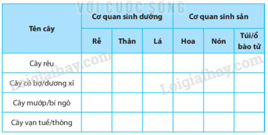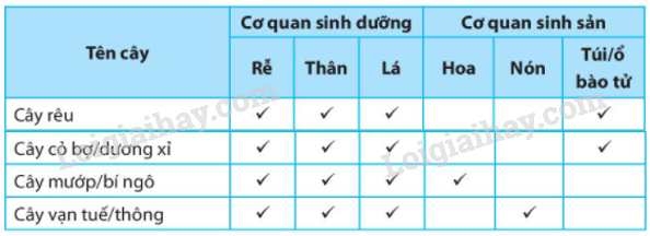 Dựa vào kết quả quan sát mẫu vật hoặc quan sát tranh, ảnh, hãy kể tên các cơ quan có ở các cây trong bảng và hoàn thành vào bảng sau: