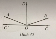 Quan sát Hình 45. Cho OD vuông góc với CC’ tại O, \(\widehat {AOC} = 160^\circ ,{\rm{ }}\widehat {AOB} – \widehat {BOC} = 120^\circ \).