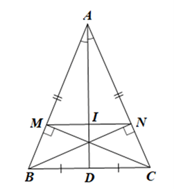 – Chứng minh \(\Delta A{\rm{D}}B = \Delta A{\rm{D}}C(c – c – c)\) suy ra \(\widehat {ABC} = \widehat {ACB}\) hay \(\widehat {MB{\rm{D}}} = \widehat {NC{\rm{D}}}\)