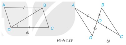 Trong mỗi hình bên (H.4.39), hãy chỉ ra một cặp tam giác bằng nhau và giải thích vì sao chúng bằng nhau.