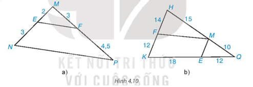 Ta có: \(\dfrac{{EM}}{{EN}} = \dfrac{2}{3};\dfrac{{MF}}{{PF}} = \dfrac{3}{{4,5}} = \dfrac{2}{3}\) nên \(\dfrac{{EM}}{{EN}} = \dfrac{{MF}}{{PF}}\)