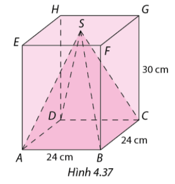 Từ một khối gỗ hình hộp chữ nhật \(ABCD.EFGH\), người ta cắt ra một hình chóp tứ giác đều \(S.ABCD\) (Hình 4.37). Tính thể tích của khối gỗ còn lại.