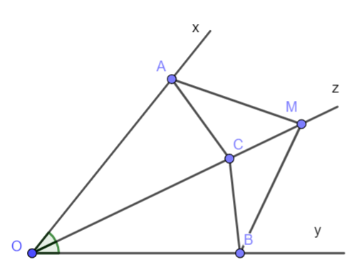 \(\widehat {xOz} = \widehat {zOy},A \in Ox,B \in Oy,C \in Oz,\)\(\widehat {CAO} = \widehat {CBO}\)