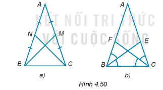 Cho ABC là tam giác cân tại đỉnh A. Chứng minh rằng: a) Hai đường trung tuyến BM, CN bằng nhau (H.4.50a). b) Hai đường phân giác BE, CF bằng nhau (H.4.50b)