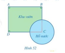Một khu vườn có dạng tứ giác ABCD với các góc A, B, D là góc vuông, AB = 400 m, AD = 300 m. Người ta đã làm một cái hồ nước có dạng hình tròn, khi đó vị trí C không còn nằm trong khu vườn nữa (hình 52). Tính khoảng cách từ vị trí C đến mỗi vị trí A, B, D.