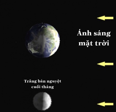 Em hãy vẽ hình để giải thích hình ảnh nhìn thấy Trăng bán nguyệt cuối tháng.
