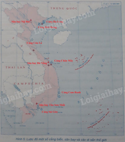 Giải bài 4 trang 20 tập bản đồ Địa lí 9, Dựa vào nội dung SGK và kiến thức đã học, em hãy điền tên các cảng biển lớn và các sân bay quốc tế vào chỗ chấm (…) của lược đồ hình 5 trang 21.