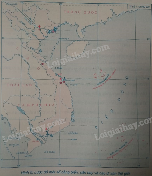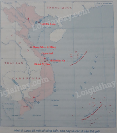 Giải bài 4 trang 21 tập bản đồ Địa lí 9, Dựa vào nội dung SGK và kiến thức đã học, em hãy điền tên các di sản thế giới: Vịnh Hạ Long, Phong Nha – Kẻ Bàng, Cố đô Huế, Di tích Mĩ Sơn, Phố cổ Hội An vào chỗ chấm (…) của lược đồ dưới đây: