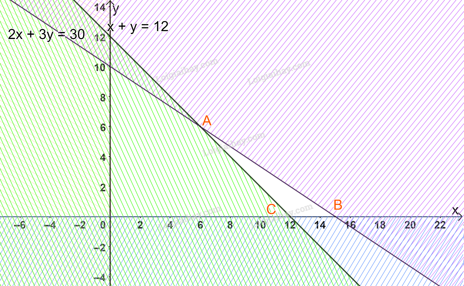 Từ đó ta có hệ bất phương trình: \(\left\{ \begin{array}{l}2x + 3y \le 30\\x + y \ge 12\\x \ge 0\\y \ge 0\end{array} \right.(x,y \in \mathbb{N})\)