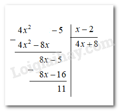 Vậy \( (4{x^2} – 5):(x – 2)= 4x + 8 + \dfrac{{11}}{{x – 2}}\)
