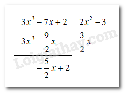 Vậy \( (3{x^3} – 7x + 2):(2{x^2} – 3)= \dfrac{3}{2}x + \dfrac{{\dfrac{-5}{2}x + 2}}{{2{x^2} – 3}}\)